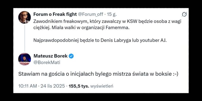 Od wczoraj trwa dyskusja na temat freaka, który rzekomo ma wystąpić na gali KSW w grudniu. Hubert Mściwujewski poinformował, że według jego informacji będzie to zawodnik wagi ciężkiej, który walczył w FAME MMA i Clout MMA. Mateusz Borek w serwisie X skomentował wpis użytkownika Forum o Freak fight, sugerując, że jego typem jest Adam Josef, znany jako AJ the Polish American.
