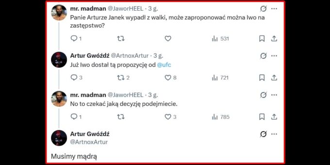 Kilka chwil temu Jan Błachowicz poinformował, że doznał kontuzji, która wyklucza go z walki z Bogdanem Guskovem. Nieszczęście Jana może okazać się szczęściem dla Iwo Baraniewskiego, który – według słów Artura Gwoździa – dostał ofertę wejścia na zastępstwo. Oto wymiana zdań menadżera Iwo z użytkownikiem serwisu X: