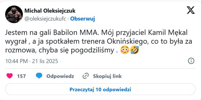 Wpis z profilu X Michała Olsksiejczuka – oleksiejczukufc.